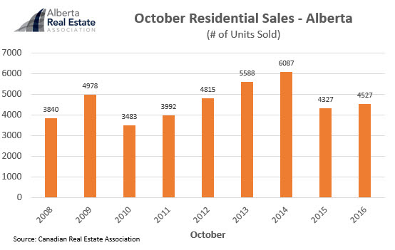 The Alberta Real Estate Association (AREA) reports that a total of 4,527 residential unit sales were recorded through the MLS® Systems of real estate Boards/Associations in Alberta in October, rising 4.6 per cent from the same month last year. This was the first year-over-year gain since November 2014.
